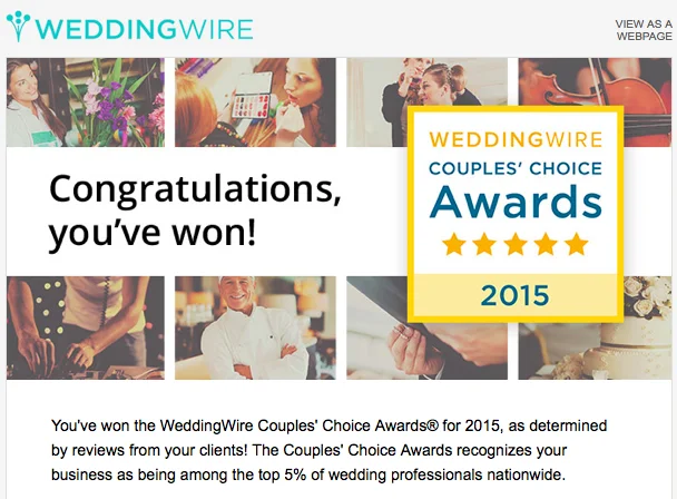 Back in 2012, we were awarded our first ever Couples' Choice award from Wedding Wire. I didn't know much about it at that point. I definitely didn't understand what a huge honor it was. For those of you that don't know what it is, the Couples' Choice is given to the top 5% of a wedding category (wedding videographers for us)! And it is all because of people saying nice things about us. How cool is that!!!! I really kind of thought that it was given to us just because I was an advertiser. ha!